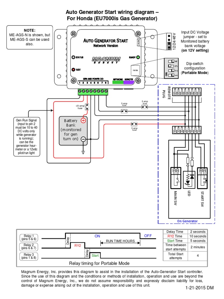 Be sure the module is low enough that the battery connections will reach the battery. Auto Generator Start wiring diagram For Honda EU7000is Gas Generator 1-21-2015 DM 5 amp fuse Magnum Energy Inc. Remote Engine Starter System The remote engine starter will only operate provided all the following conditions are met.